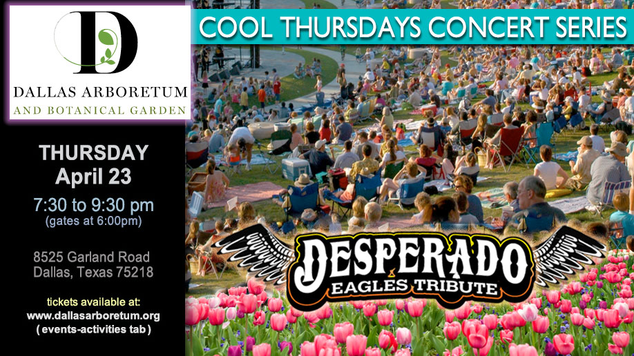 Make 2026 a year to remember at Dallas’ most scenic concert series—celebrating 29 years of live music, fun, and unforgettable sunsets over White Rock Lake. The 2026 Cool Thursdays Concert Series, presented by HilltopSecurities, kicks off with Desperado–Eagles Tribute. Gates open at 6pm so arrive early for a garden stroll before the show!
